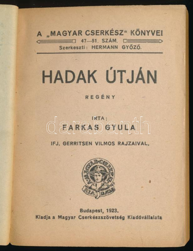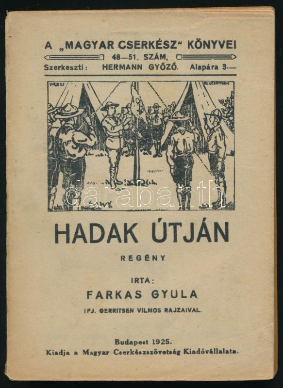 Farkas Gyula: Hadak útján. Bp., 1925, Magyar Cserkészszövetség. Kiadói... https://www.darabanth.com/hu/504-Gyorsarveres/504.0/Mutargy-papirregiseg-egyeb/Cserkesz~1000010/Farkas-Gyula-Hadak-utjan-Bp-1925-Magyar-Cserkeszszovetseg-Kiadoi-papirkotes-felvaga~II3421365