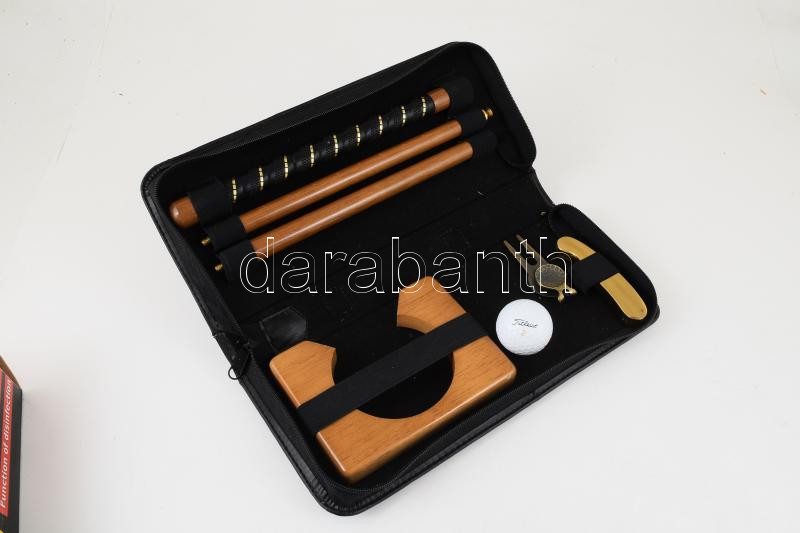 Leírás: Szobai mini golf készlet, tartójában, jó állapotban.