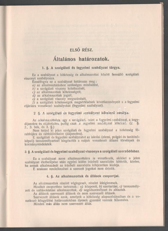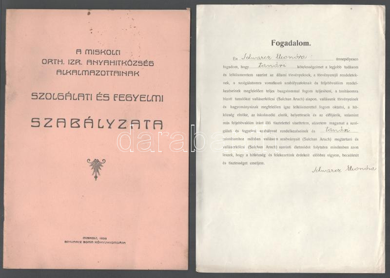 A miskolci orth. izr. anyahitközség alkalmazottainak szolgálati és fegyelmi szabályzata. Miskolc, 1935. Schwartz Soma. 20p. az utolsó oldalon egy alkalmazott tanítónő átvételi igazolásával, valamint külön lapon fogadalmi esküszövegével és jegyzőkönyvvel.