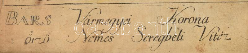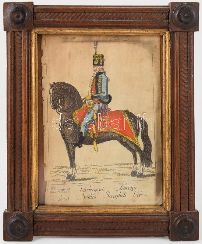 Bars vármegyei korona őrző nemes seregbeli vitéz. Színezett rézmetszet, papír. Jelzés nélkül. Kissé foltos, lapszéli apró sérülésekkel. Üvegezett fakeretben. 17x12 cm