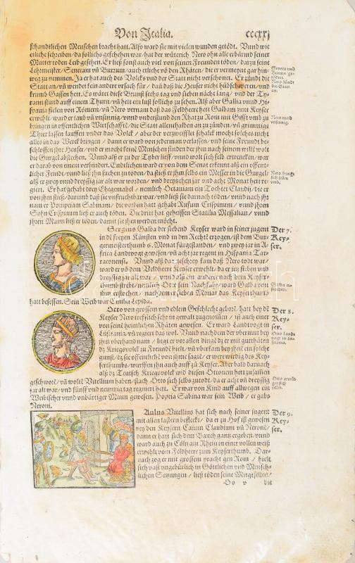 Gergius Galba, Nagy Ottó, Aulus Vitellius, Flavius Vespasianus, Titus Vespasianus római uralkodók tetteit bemutató lap Münster, Sebastian: Cosmographiae. Basel, 1580. , fametszet, papír, . Színezett fametszet 5 db képpel Lap méret 22x35 cm