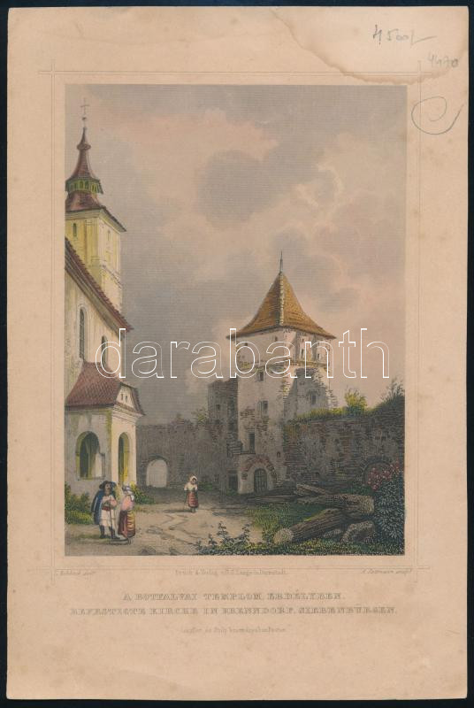 Ludwig Rohbock (1820-1883)-A. Rottmann: A botfalvai templom Erdélyben (Befestigte Kirche in Brenndorf, Siebenbürgen), színezett acélmetszet, papír, jelzett a metszeten, foltos, 16x11,5 cm