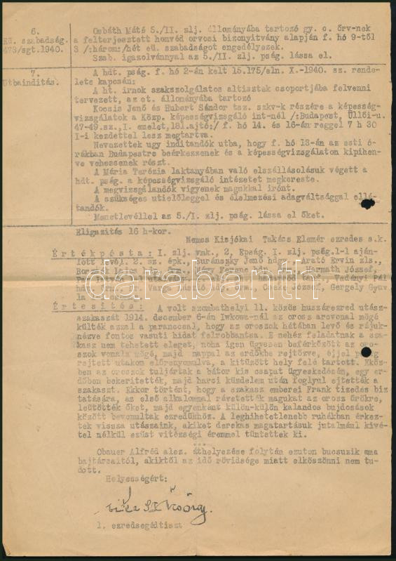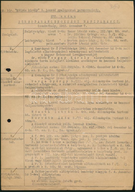 Leírás: 1940 A Mátyás király 5. honvéd gyalogezred ezredparancsnokság napiparancs