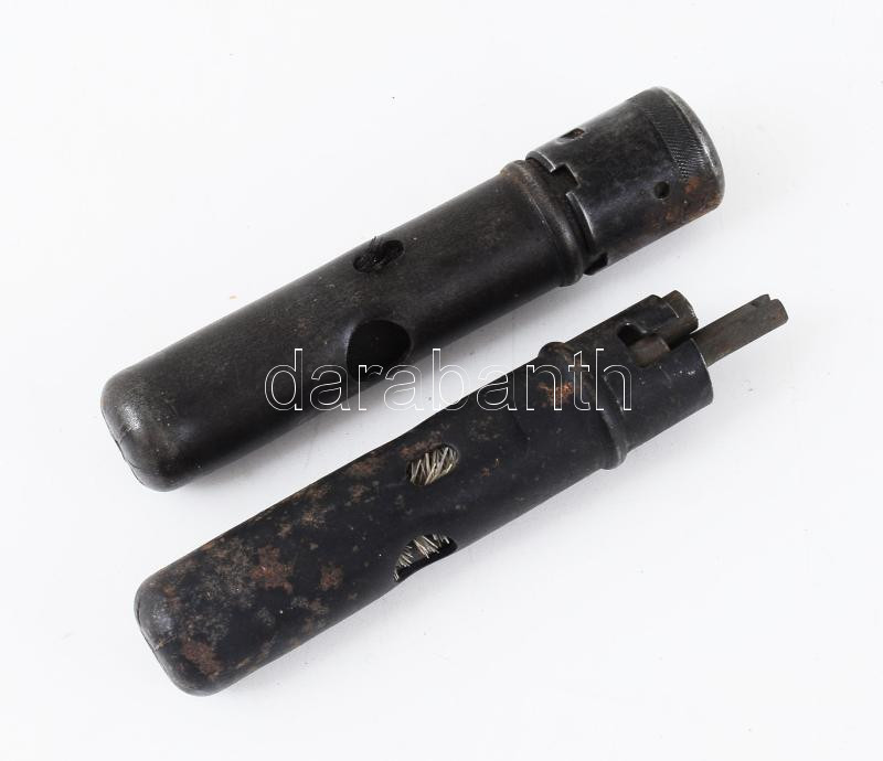 Leírás: 2 darab régi fegyvertisztító készlet, egyik hiánnyal, h: 9 cm