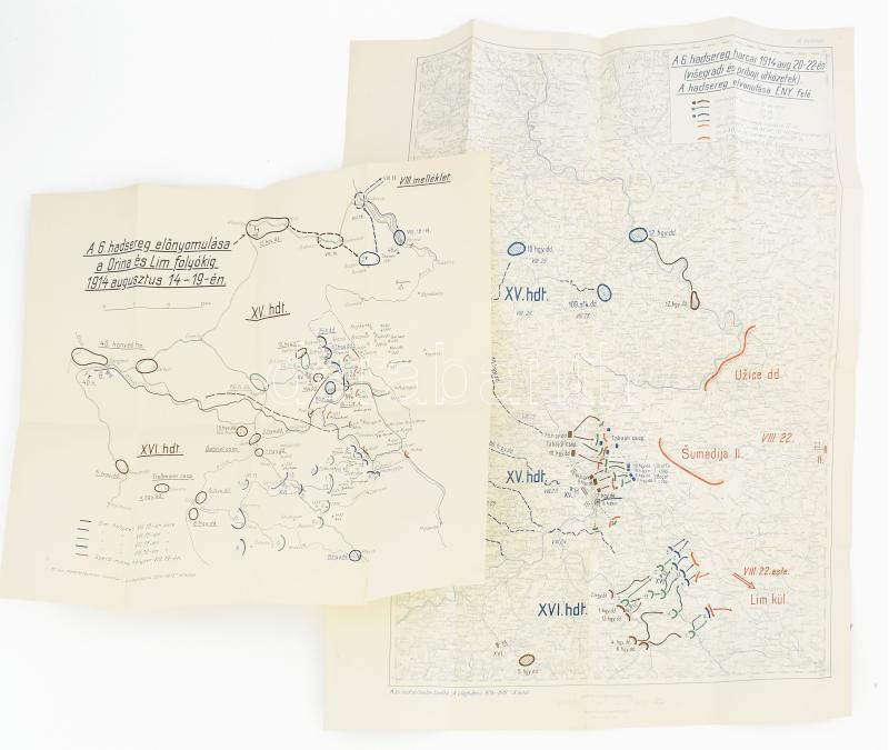 A 6. hadsereg hadmozdulatai 1914. augusztusában, 2 db térkép (a M. Kir. Hadtörténelmi Levéltár által kiadott, A világháború 1914-1918. c. mű mellékletei), 38x48 cm és 62x49,5 cm