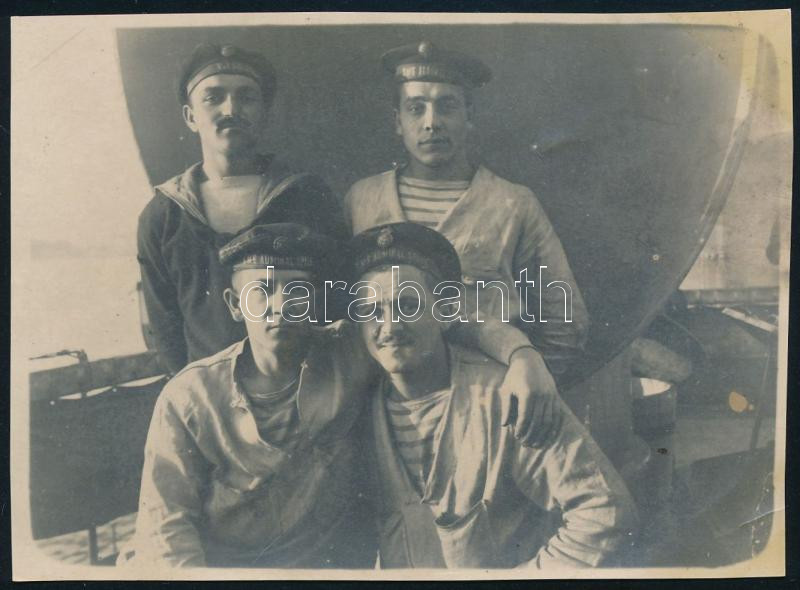 cca 1905 Az S.M.S. Admiral Spaun osztrák-magyar gyorscirkáló hadihajó matrózainak csoportképe / Four sailors pose for the camera on the deck of S.M.S. Admiral Spaun.. 10x7,5 cm
