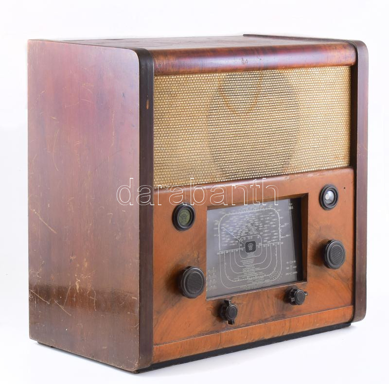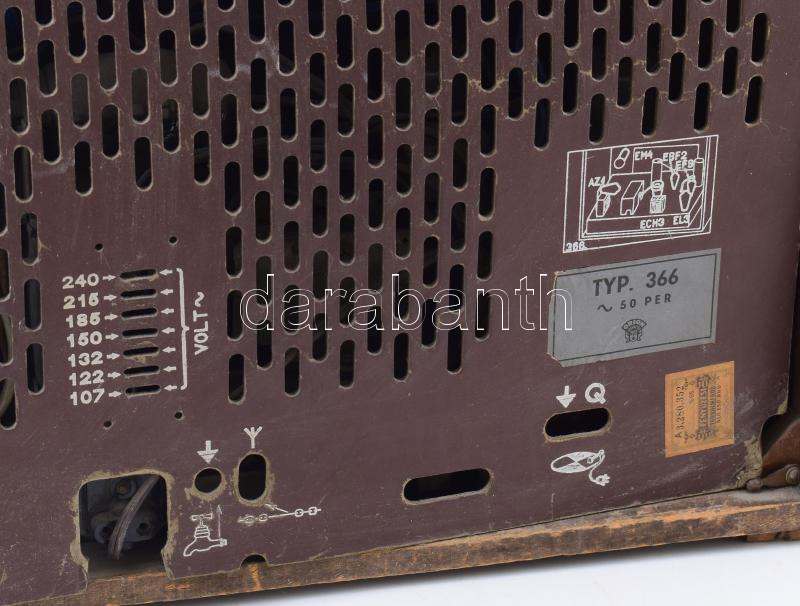 1942-1944 Orion 366 rádió. 4+2 csöves, háromhullámsávos (R-K-H), héthangoltkörös, váltóáramú készülék sávszűrő s bemenettel, kettős óraskálával, rövidhullámon újszerű sávnyújtással, kombinált hangszín és szelektivitásszabályozóval. Korának megfelelő állapotban, nem kipróbált, 44x26x45 cm /// 1942?1944 Orion 366 radio. 4+2 tube, three-waveband (LW-MW-SW), seven-tuned-circuit, AC-operated receiver with band-pass filter and input, dual dial scale, innovative band spread on shortwave, combined tone and selectivity control. In condition appropriate for its age, untested, 44×26×45 cm