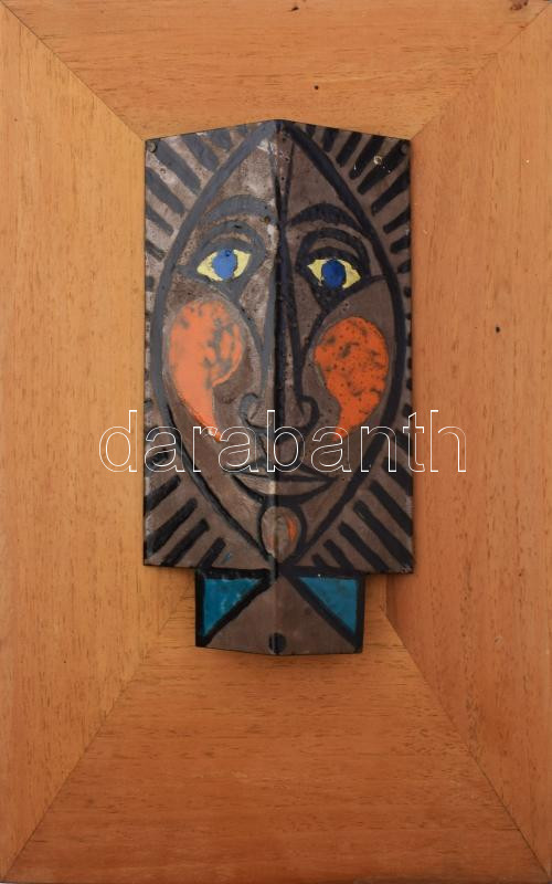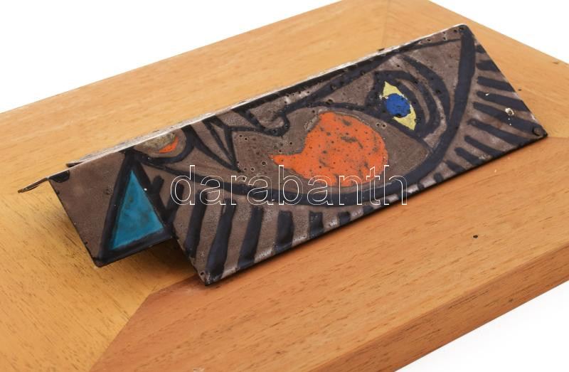 Leírás: Duray Tibor (1912 - 1988): Önarckép. Tűzzománc, fémlemez, jelzés nélkül, apró felületi sérüléssel, fatáblán, 22x11 cm.