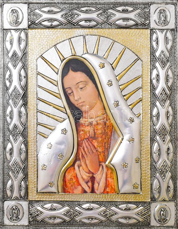 Leírás: Guadalupei Szűzanya. Szentkép fa lapon, fém okláddal, 36x28 cm