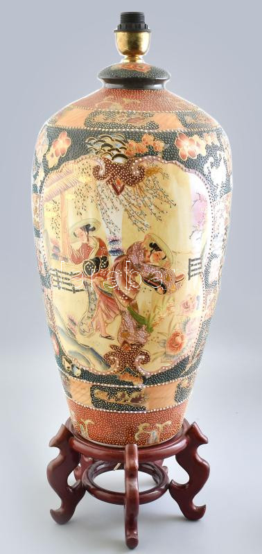 Monumentális, japán, Satsuma jellegű porcelán lámpatest, jelzés nélkül, elektromos része javításra szorul, jelenlej lámpaként nem üzemeltethető, 1950-70 körül, korának megfelelő állapotban, fa talapzaton, m: 80 cm / CSAK SZEMÉLYES ÁTVÉTELLEL!!
