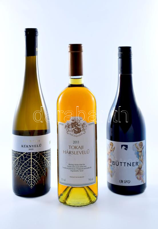 Leírás: 3 üveg bor: Büttner Balatoni Zweigelt 2018 + Dobosi Kéknyelű 2021 + Gróf Degenfeld Tokaji Hárslevelű 2011, bontatlan.