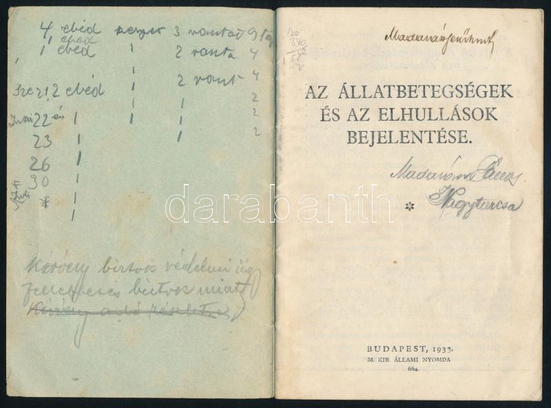 1933 Az állatbetegségek és az elhullások bejelentése, foltos, 32p https://www.darabanth.com/hu/504-Gyorsarveres/504.0/Mutargy-papirregiseg-egyeb/Nyomtatvanyok~1000017/1933-Az-allatbetegsegek-es-az-elhullasok-bejelentese-foltos-32p~II3423747