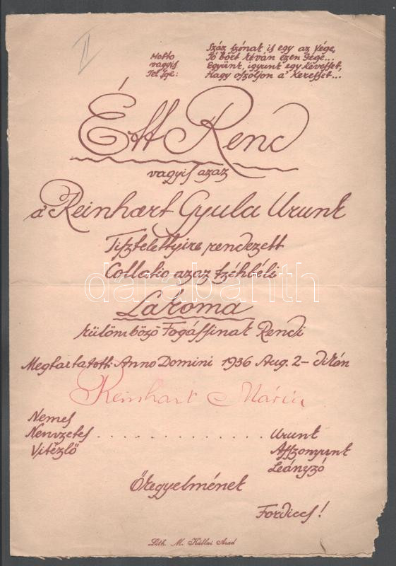 1936 Étt-rend vagyis azaz a Renhart Gyula urunk tiszteletére rendezett collatio azaz czéhbeli lakoma... Étlap. 4 p. M. KÁllai, Arad, litográfia. (2) p.