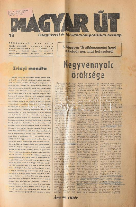 1944 A Magyar Út XIII. évfolyamának 13. száma, Turul Szövetség kiadása https://www.darabanth.com/hu/504-Gyorsarveres/504.0/Mutargy-papirregiseg-egyeb/Nyomtatvanyok~1000017/1944-A-Magyar-Ut-XIII-evfolyamanak-13-szama-Turul-Szovetseg-kiadasa~II3424723