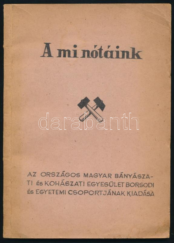 1965 A mi nótáink. Miskolc, Országos Magyar Bányászati és Kohászati Egyesület Borsodi és Egyetemi Csoportja, (3)+40+(1) p. Kiadói papírkötés, kissé foltos borítóval, a címlapon ragasztásnyomokkal.