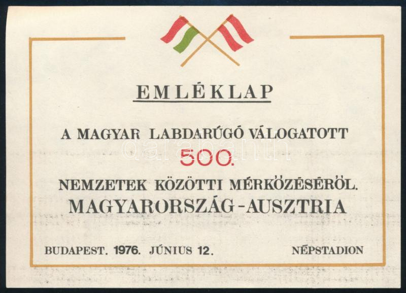 1976 emléklap a magyar labdarúgó válogatott 500. mérkőzéséről https://www.darabanth.com/hu/504-Gyorsarveres/504.0/Mutargy-papirregiseg-egyeb/Nyomtatvanyok~1000017/1976-emleklap-a-magyar-labdarugo-valogatott-500-merkozeserol~II3413507