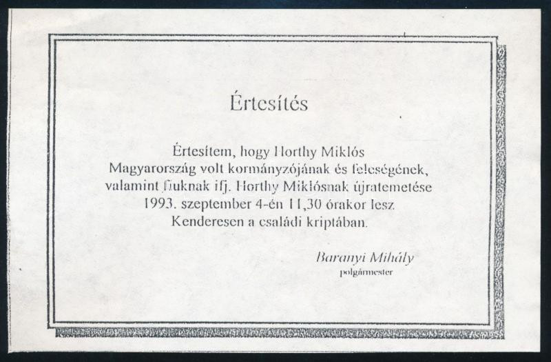 Leírás: 1993 Kenderes, értesítés Horthy Miklós kormányzó és családja újratemetéséről, 15×9 cm