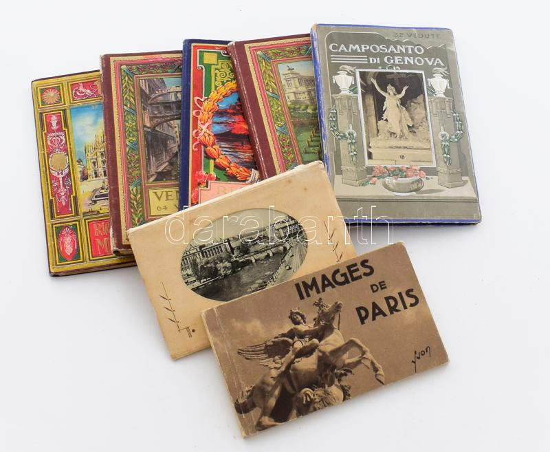 Leírás: 7 db régi külföldi városképes leporelló: Párizs, Stockholm, Róma, Nápoly, stb. Vegyes állapotban.