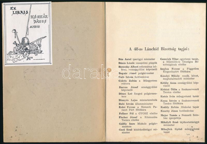 A Lánchídnak fel kell támadni. 1849-1949. Tildy Zoltán köztársasági elnök és Gerő Ernő közlekedési miniszter beszéde a Lánchíd Bizottság alakuló ülésén. Bp.,1949,(Eisler-ny.), 4 sztl. lev. Benne a 48-as Lánchíd Bizottság tagjaival. Kiadói papírkötés. Foltos Ex librissel