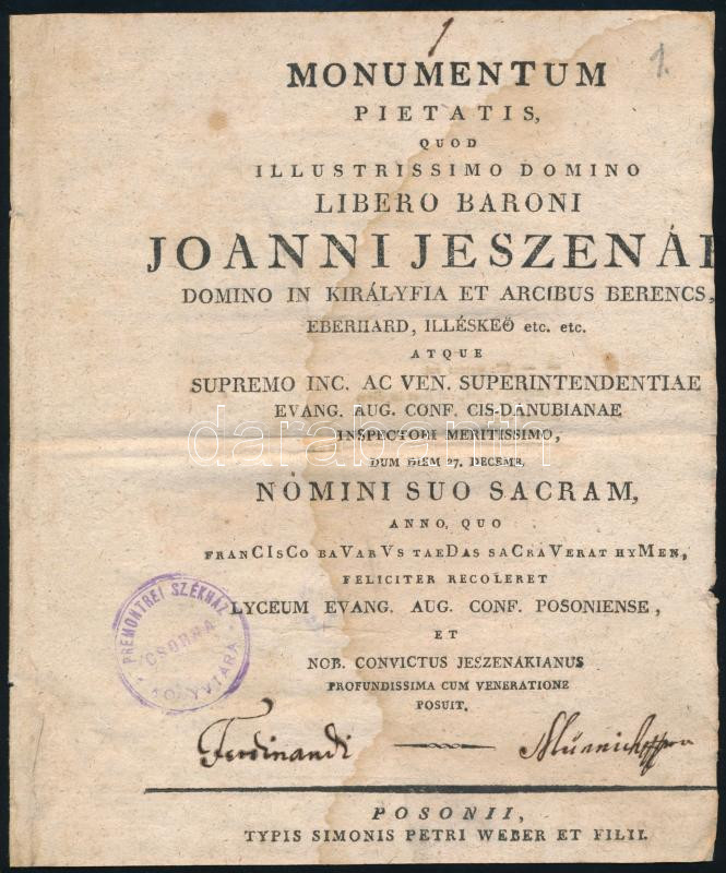 ca 1840 Monumentum pietatis... Báró Jeszenák János politikus, kormányb... https://www.darabanth.com/hu/504-Gyorsarveres/504.0/Mutargy-papirregiseg-egyeb/Nyomtatvanyok~1000017/ca-1840-Monumentum-pietatis-Baro-Jeszenak-Janos-3Cem3Epolitikus-kormanybiztos-foispan3Cem~II3420656