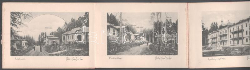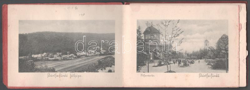 cca 1900-1910 Bártfafürdő. Kiadja: Divald Adolf, Bártfa. 16 db fekete-fehér fotót tartalmazó leporelló, kissé sérült borítóval, a leporelló sérült, két részre vált, 11x16 cm // cca 1900-1910 Bardejovské Kúpele (Bad Bartfeld / Bártfafürdő), foldout with 16 black-and-white photos, torn into two pieces, with slightly damaged cover
