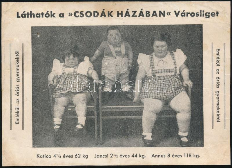 cca 1930 "Emlékül az óriás gyermekektől", láthatók a "C... https://www.darabanth.com/hu/504-Gyorsarveres/504.0/Mutargy-papirregiseg-egyeb/Nyomtatvanyok~1000017/cca-1930-Emlekul-az-orias-gyermekektol-lathatok-a-Csodak-hazaban-a-Varosligetben~II3423737