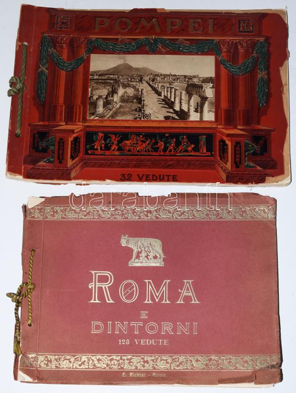cca 1930 Roma e dintorni + Pompei, 2 db képes album fekete-fehér fotókkal, mindkettÅ‘ben magyar nyelvű, 1932-es ajándékozási bejegyzéssel. Kiadói zsinórfűzéses papÃrkötés, sérült borÃtóval, néhány sérült lappal, egy lapon szakadásból eredÅ‘ hiánnyal, 20,5x27 cm és 21,5x31,5 cm