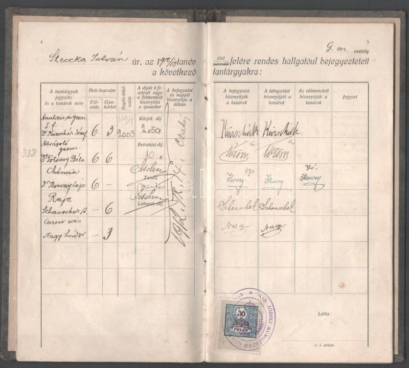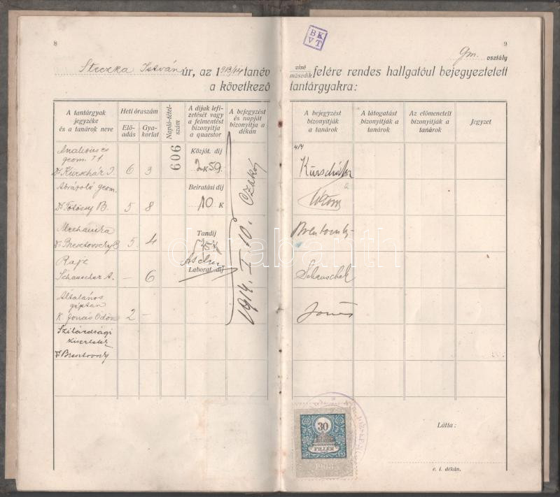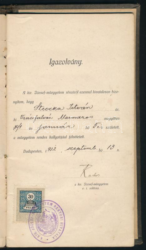 1912 Bp., a M. Kir. József Műegyetem leckekönyve Steczka István gépészmérnök hallgató részére, benne Rados Gusztáv (szül. Raussnitz) (1862-1942) rektor, Kürschák József (1864-1933), Tötössy Béla (1854-1923), Ilosvay Lajos (1851-1936) és mások aláÃrásával, okmánybélyegekkel