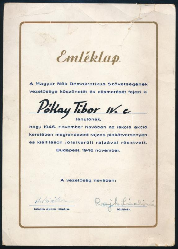 1946 Bp., A Magyar Nők Demokratikus Szövetsége által kiállított emlékl... https://www.darabanth.com/hu/504-Gyorsarveres/504.0/Mutargy-papirregiseg-egyeb/Okmanyok~1000002/1946-Bp-A-Magyar-Nok-Demokratikus-Szovetsege-altal-kiallitott-emleklap-szakadassal-ragas~II3424841