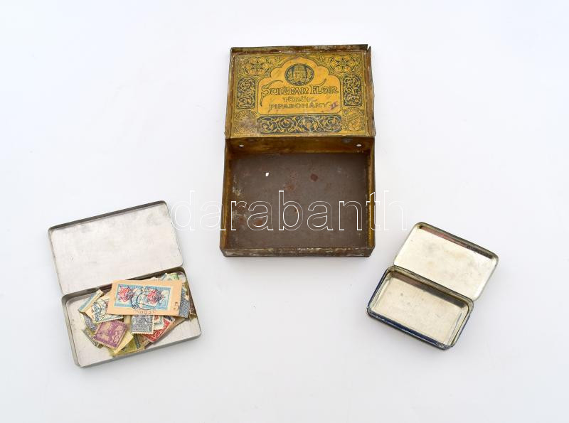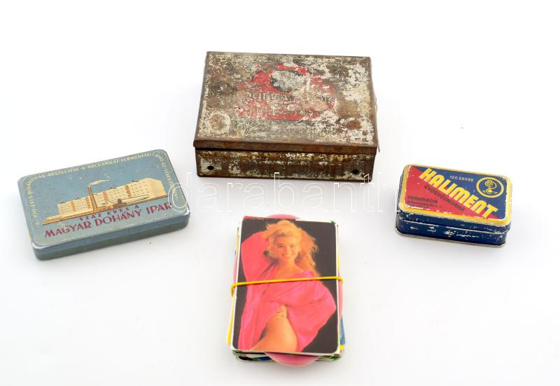 3 db fémdoboz: Száz éves a Magyar Dohányipar, Kaliment gyógycukorka, Sultan Flor török pipadohány, utóbbi megviselt állapotban, 8x5 cm és 14x11,5 cm között + Vegyes kártyanaptárak, kb. 40 db