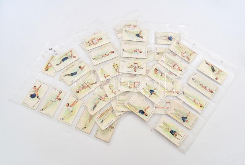 Wills's Cigarettes brit cigaretta-gyűjtőkártyák, 50 db-os komplett sorozat (testnevelés), albumlapokon / British cigarette cards, complete series of 50 (Physical Culture), in album sheets