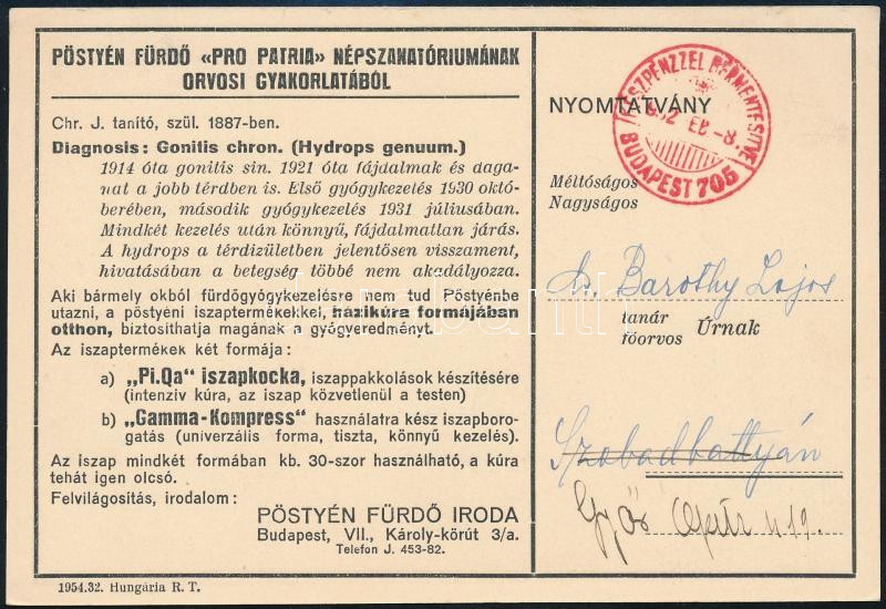 1932 Pöstyénfürdő (Felvidék), Pro Patria Szanatórium által alkalmazott reumatikus iszapkocka kezelés reklámlapja magyar nyelven, postán feladva, 11×16 cm