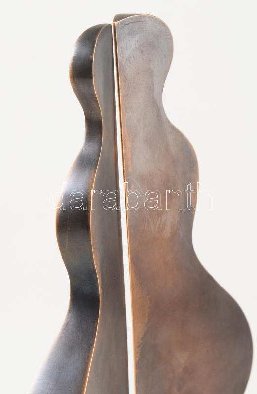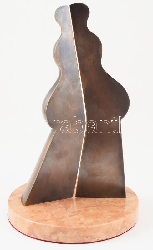 Deim Pál (1932-2016): Bábu. Patinázott bronz, márvány talapzaton. Jelzett DP. d: 16 cm, m: 25 cm. Deim Pál művészetében, a stilizált bábu az egyik legjellegzetesebb motívuma, amely mint egy embernek a emlékműve, mely térsíkok közé van szorítva, jelenik meg, mind a festészetében úgy a kisplasztikáin is. Foglalkoztatta a magányosság és az emberben lévő kettősség és a világban helyét kereső ember kérdése is. Barcsay Jenő és Vajda Lajos művészete egyszerre inspirálta.