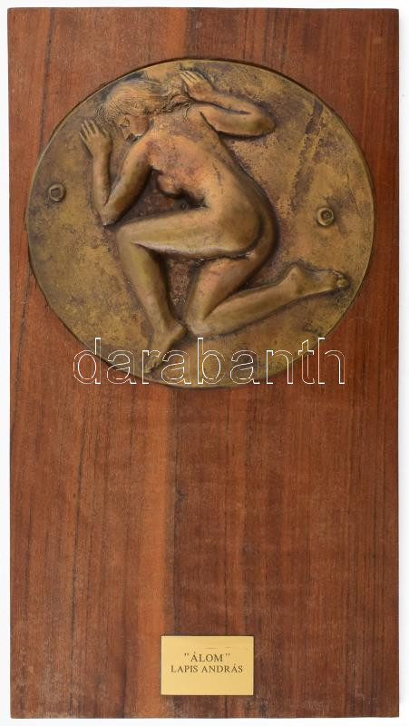 Leírás: Lapis András (1942-): Álom. Bronz plakett fa lapban, d: 19 cm, 41x21,5 cm