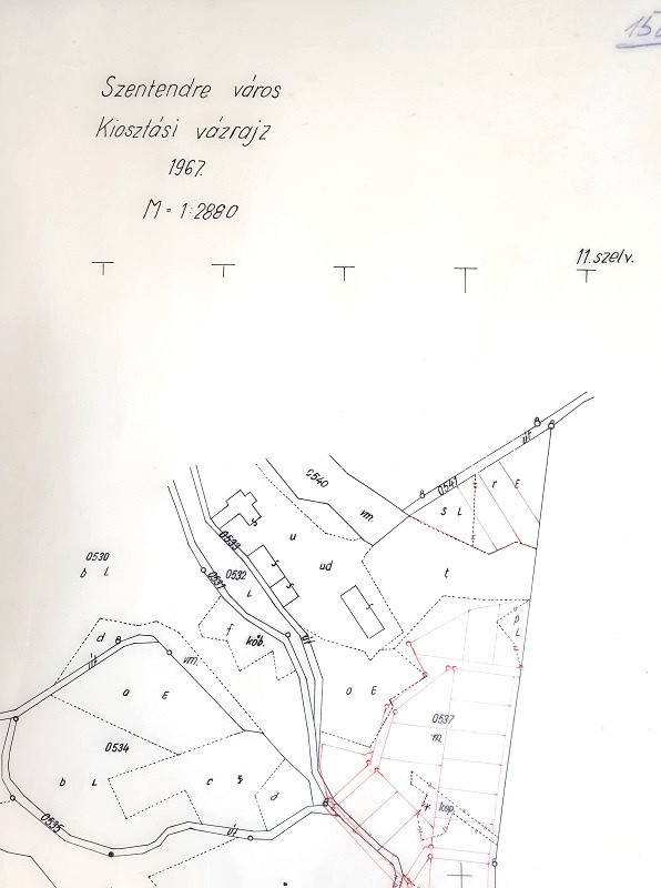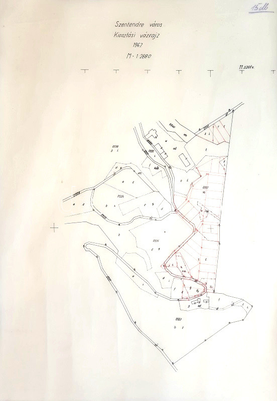 [Térkép] Szentendre város kiosztási vázrajza. Parcellázási terv a város Kisboldogtanya nevű gyümölcsösében. Mértéke: 1:2,880. (1967) Szentendre, 1967. Vörös és fekete tussal húzott parcellázási térképkézirat. Mérete: 250x180 mm egy 335x240 mm méretű pausz térképlapon. Térkép-kéziratunk értékes adattal szolgál Szentendre kora-Kádár-kori urbanizációs történetéhez. Szentendre, a patinás kisváros az első világháború előtt még az ország egyik legkisebb lélekszámú városa volt, lakossága a trianoni döntés után nőtt meg számottevően, amikor Erdélyből számosan költöztek ide, valamint a város szépségét felfedező művészek is mind többen. 1965 környékén azonban még nem indult meg a város rohamos fejlődése, ekkoriban nagyjából tízezren lakták a várost. 1967-ből származó előzetes parcellázási tervünk azonban arra mutat rá, hogy az igények növekedésével a város két legészakabbi területét, az 1934-ig Leányfaluhoz tartozó, a Visegrádi-hegységre meredeken felfutó Boldogtanya és Kisboldogtanya nevű területeket - korábbi gyümölcsösöket - dobra verte a helyi pártvezetés, így megkezdődhetett Szentendre legészakabbi területeinek parcellázása. Tussal rajzolt, ceruzás számozással kiegészített térképünk vörös színnel Kisboldogtanya gyümölcsösének parcellázásra szánt területeit mutatja, az utcahálózat megegyezik a maiakkal, ám térképvázlatunkon az utcák még csupán számneveket viselnek. Térképünkön az utcahálózaton kívül az egykori épületállomány is megtalálható, ennek nyomán kijelenthető, hogy térség a parcellázás idején jóformán lakatlannak számított, gazdasági épületek tűnnek fel rajta, ritkásan. Térképünk keleti határát a Szitakötő utca alkotja, valamint a Sziklás-patak erdője, déli részén rézsútosan találkozik a környék legelője és erdője, majd a mai Szivárvány utca írja le erős kanyarjait, a nyugati határon folytatódik a Szivárvány utca vonala, valamint a belőle elágazó Cserebogár, majd Rét utca, északon a Rét utca és az Irtás utca határvonala választja el Kisboldogtanya területét északi szomszédjától, Boldogtanyától. Térképünk tanúsága szerint ingatlanfejlesztésre kizárólag a terület legkeletebbi részét, nagyjából a terület egyötödét szánták, a helyzet azóta kissé változott, mára nagyjából a terület fele szolgál nyaralóként vagy állandó lakhelyént, a térképvázlatunk közepét jelenti 534 és 536 számmal jelölt térségek benépesültek, ám a legdélebbi rész, a Sziklás-patak völgye beépítetlen maradt (537), illetve északon az 530-as és 532-es rész tájsebeit (kőbányáját) felszámolták, a vidék azóta is zöldövezetként funkcionál. Címfeliratozás fent, középen. Emlékezetes ingatlanfejlesztési korlenyomat. Jó állapotú térképlap.