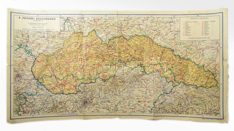 cca 1939 A "Felvidék" közigazgatási térképe, rajta a visszatért területekkel, tervezte és rajzolta: Kogutowicz Manó, 1:900.000, Bp., Magyar Földrajzi Intézet Rt., 36x71 cm beszakadásokkal