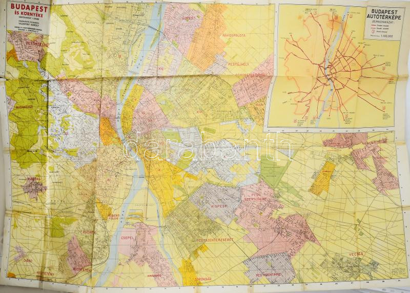cca 1945 Valentiny Károly: Budapest és környékének térképe, 1 : 25.000, (rajta Budapest autótérképe, 1 : 100.000), Bp., Gergely Rezső könyvkereskedés kiadása (Közlekedési-ny.), kis sárülésekkel a szélén , 117x81 cm
