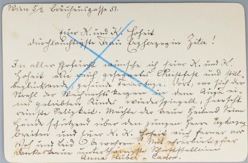 1913 Anna Huber-Cador (1857-1938) írónő, nevelőnő karácsonyi üdvözlete Pármai Zita főhercegnének / 1913 Christmas greetings of Anna Huber-Cador (1857-1938), writer and educator, to Archduchess Zita of Parma