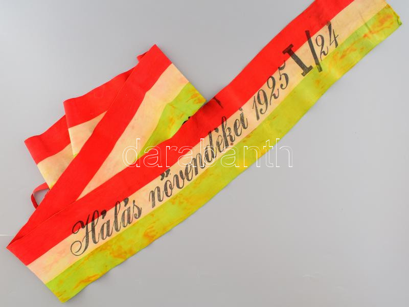 1925 Trikolor emlékszalag "Hálás növendékei 1925 I/24" felir... https://www.darabanth.com/hu/504-Gyorsarveres/504.0/Mutargy-papirregiseg-egyeb/Tortenelmi-dokumentumok-keziratok-erdekessegek~1000003/1925-Trikolor-emlekszalag-Halas-novendekei-1925-I24-felirattal-12x-155-cm~II3409413