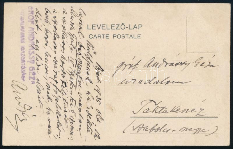 Leírás: ca 1910 Andrássy Géza, gróf (1856-1938) nagybirtokos, politikus, az MTA igazgatósági tagja autográf sorai saját uradalmának címezve