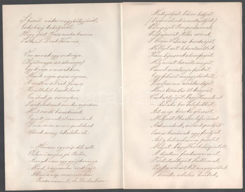 Leírás: cca 1850 Deák Ferencz csutorája c. kéziratos verses költemény 10 beírt oldalon. Junius Brutus aláírással