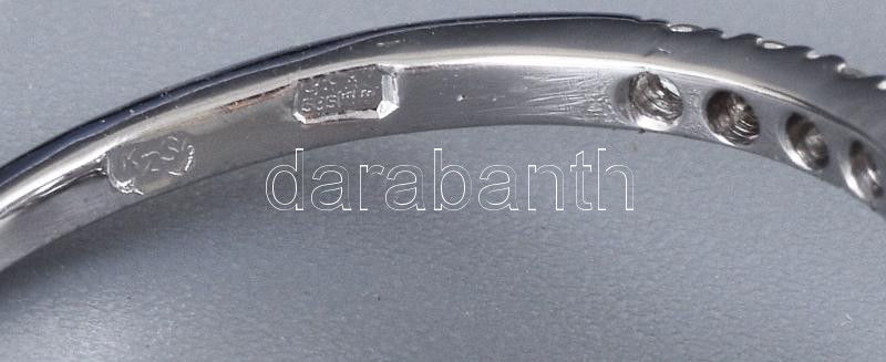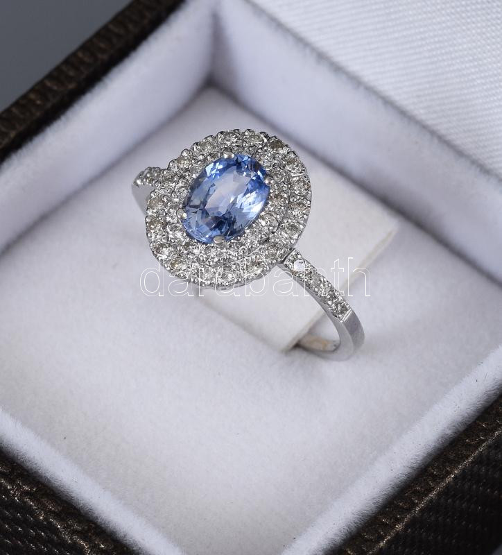 Leírás: 14 K fehérarany gyűrű brillekkel (0,43ct) és zafírral (1,16ct) TW, VS, jelzett, tanúsítvánnyal m: 55, m: 1,16 ct