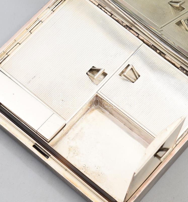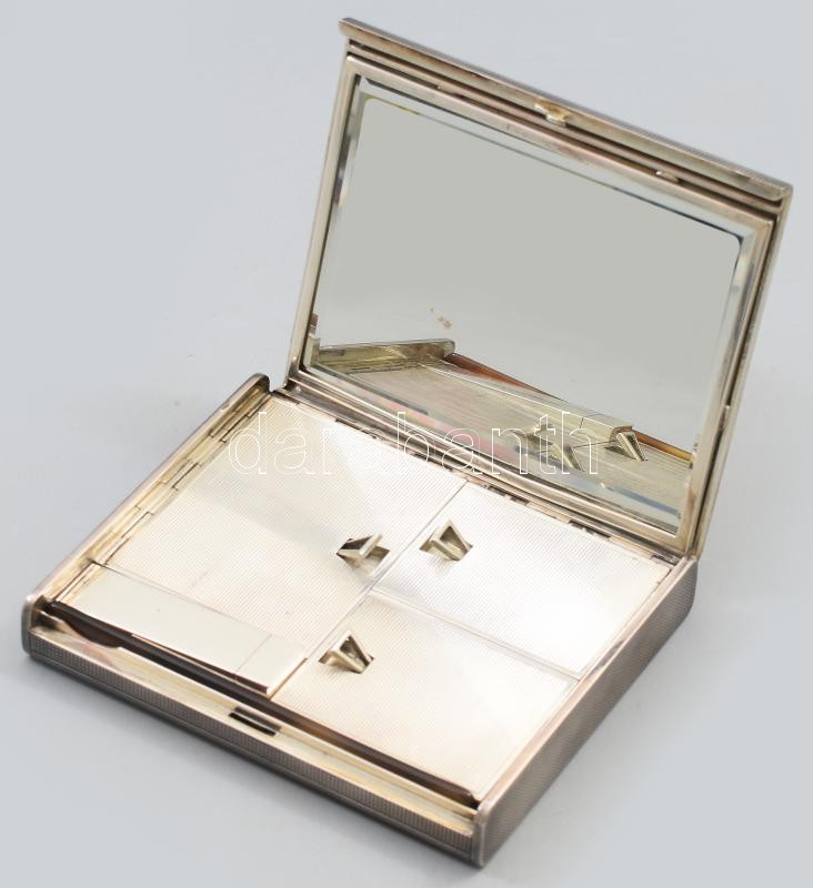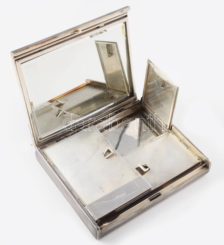 Art deco olasz vagy angol ezüst (Ag) utazó piperetartó szett, jelzett, FF mesterjeggyel, kipattintható fedelű részekkel, kivehető rúzstartóval, teknőspáncél fésűvel, tükörrel, 10x12 cm,, bruttó 563g