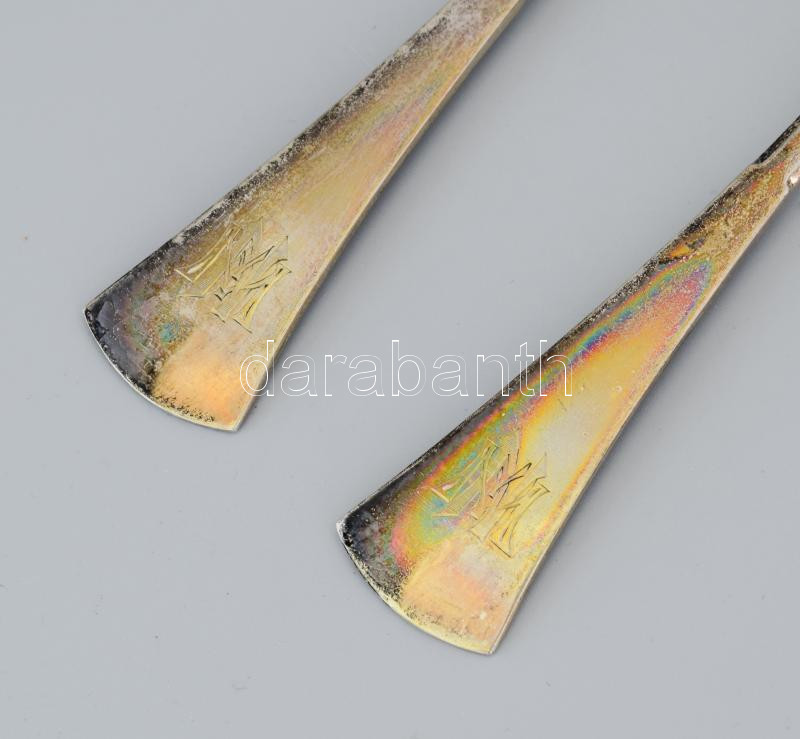 Leírás: Ezüst (Ag) 6 darabos kanál szett, jelzett, mesterjeggyel, monogramos, h: 22 cm, nettó 418g
