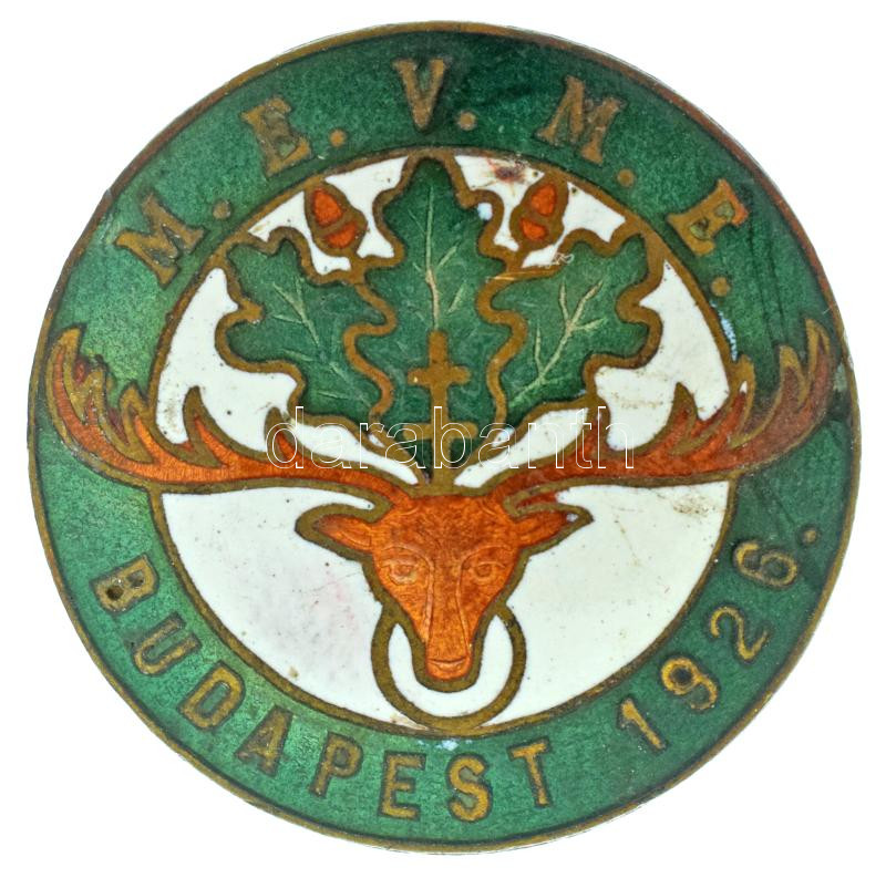 1930 k. "MEVME Budapest 1926 (Magyar Erdészeti és Vadászati Műszaki Egyesület)" zománcozott bronz jelvény "Jerouschek BPest Semmelweis u. 7." gyártói jelzéssel (28mm) T:XF kis zománchiba, pótolt tű