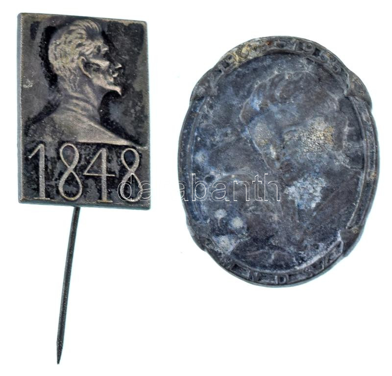 Leírás: 1942. "Petőfi Sándor 1848" fehérfém jelvény (26x18mm) + 1955. "MNDSZ (Magyar Nők Demokratikus Szervezete)" Zn jelvény (32x25mm) T:VF,F patina