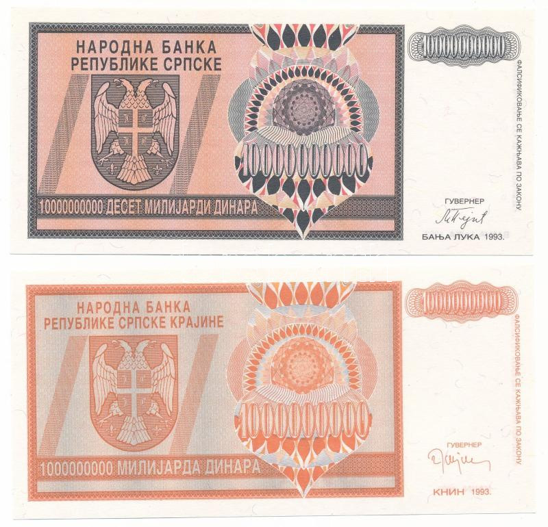 Bosznia-Hercegovina / Szerb Köztársaság / Banja Luka 1993. 10.000.000.000D sorszám nélkül + Horvátország / Krajna Szerb Köztársaság / Knin 1993. 1.000.000.000D sorszám nélkül T:UNC Bosnia and Hercegovina / Serbian Republic / Banka Luka 1993. 10.000.000.000 Dinara without serial number + Croatia / Republic of Serbian Krajina 1993. 1.000.000.000 Dinara without serial number C:UNC
