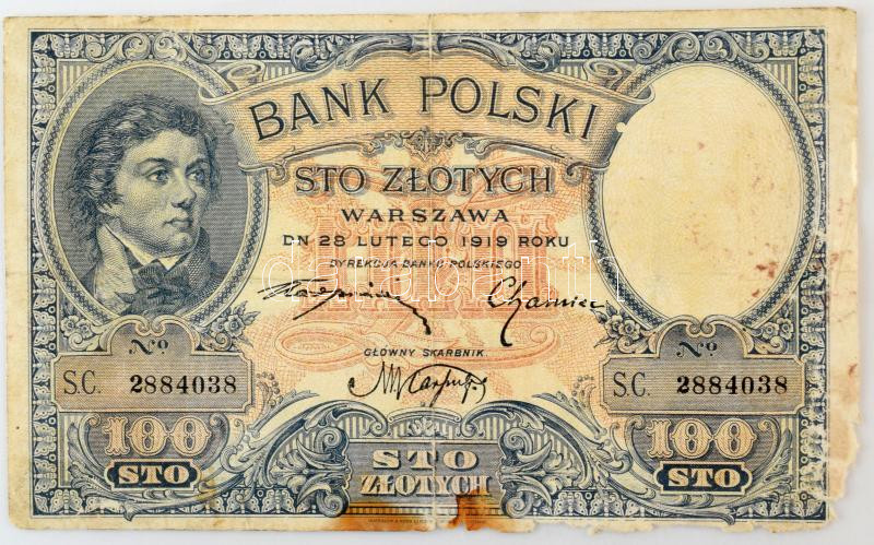Poland 1919. 100 Zlotych "S.C. 2884038" C:VG,G, missing material