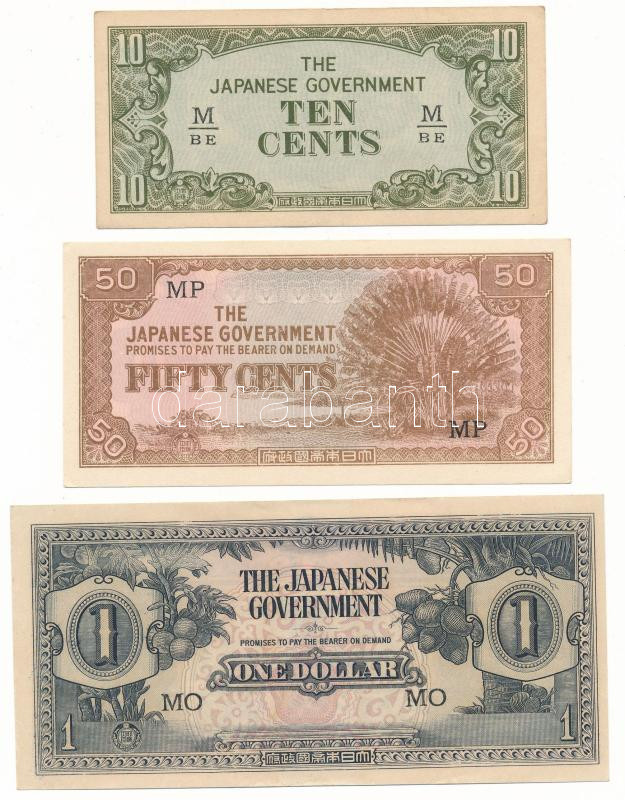 Leírás: Malajzia / Malaja / Japán megszállás 1942. 10c "M/BE" + 50c "MP" + 1942-1945 1$ "MO", "Banán Pénz" T:AU,XF