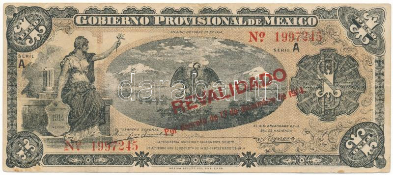 Mexico / Gobierno Provisional de México 1914. 1 Peso with red "REVALIDADO" overprint, "A 1997245" C:F,VG
